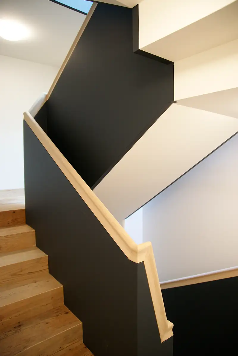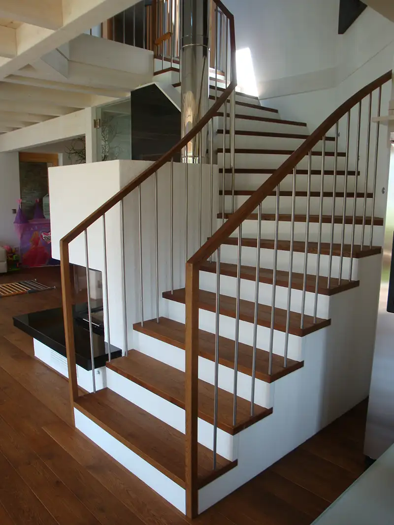 Wir setzen für unsere attraktiven Treppen und Geländer nach Maß ausschließlich heimische Hölzer ein. Wir beraten Sie gerne bei der Wahl der optimalen Holzart. Die Hölzer selbst suchen wir gemeinsam mit Ihnen mit viel Feingefühl aus. Wir achten darauf, dass jedes Element perfekt passt. Gerne verwirklichen wir für Sie noble und robuste Kombinationen von Holz und Stahl. Alle Elemente fertigen wir bei uns im Werk. Wir liefern pünktlich und übernehmen die Montage vor Ort. Wir arbeiten mit digitalem Aufmaß, wodurch ein hoher Grad der Vorfertigung erreicht wird.